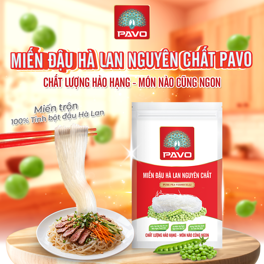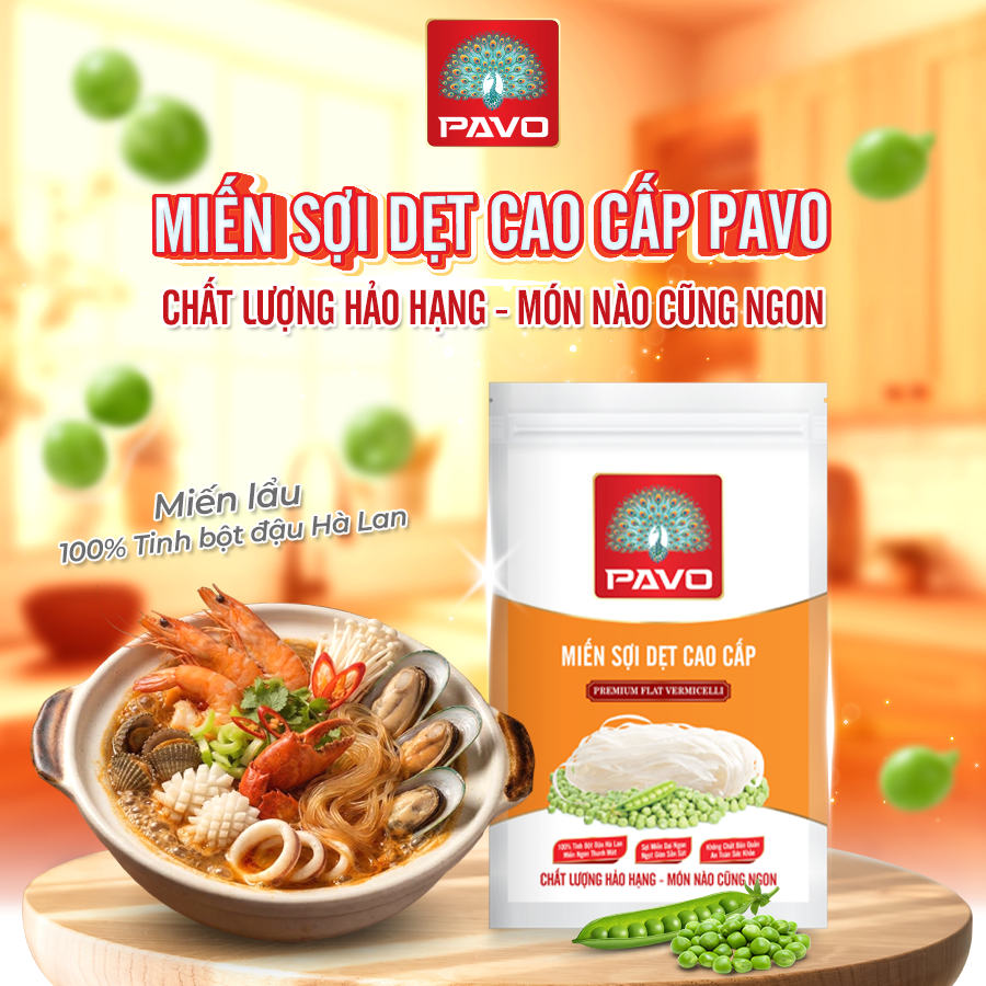 • Miến Sợi Dẹt Cao Cấp – PAVO: Được sản xuất từ 100% tinh bột đậu Hà Lan, sản phẩm mang đến sợi miến dẹt chất lượng vượt trội với độ dai giòn tự nhiên, giữ trọn kết cấu ngay cả khi nấu trong thời gian dài.