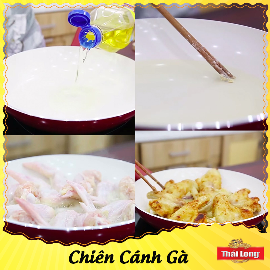 Đầu tiên bắc chảo lên bếp, sau đó cho 3 muỗng canh dầu ăn vào và đun với lửa nhỏ. Tiếp đến lấy đũa thử dầu, nếu nổi bong bóng là dầu đã nóng, lúc này mình mới cho cánh gà vào chiên.